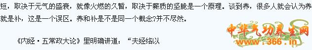 第三就是“养元”。元气是人们安身立命,健康长寿的总宰。是人体精、气、神统摄的总汇。清代医学家徐灵胎这样描述说:“元气者,视之不见,求之不得,附于气血之内,宰乎气血之先,其成形之时,已有定数”。并说:“无火而能令百体皆温,无水而能令五脏皆润,皆赖此也”。这就是说,元气是人的生命之本,生命之源。虽然它是视之不见,求之不得,但它却是实际存在的,并且对人的身体健康,生命寿天起着决定性的作用。他还把元气对于生命比喻为薪柴与火的关系:“譬如置薪于火,始燃尚微,渐久则烈,薪力即尽,而火熄矣。其有久暂之殊者,则薪之坚脆异质也”。大意是:生命的长