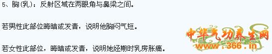 2、心脏:反射区域在两眼角之间的鼻梁处。