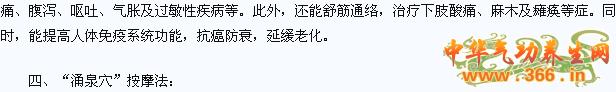 按摩方法:端坐,先将右脚架在左腿上,以右手握着脚趾,再用左手掌摩擦右脚心之涌泉穴位,不计数,以脚心发热为止。再将左脚架在右腿上,以左手掌摩擦右脚心涌泉穴位,也是以脚心发热为止。