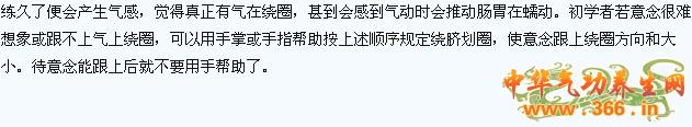 3、绕脐转圈:做完下述程式后,务必等动作完全停了下来,才作本程式:意想着肚脐内有气,用意想象气自脐部左上角起,向右向下向左向上绕圈成逆时针方向绕着肚脐边转圈,由小圈转到大圈,转三十六圈,绕到最大圈时的范围上不超过肋弓,下不超过骼骨和耻骨,即是限制在腹部的软组织范围内绕圈(图7),绕完三十走圈就反过来转圈,由大到小,顺时针方向转三十六圈,使气归于原左上角部位,然后把气收入肚脐内。以上是男性做的。女性做的则与男性相反,先从右上角起,由小圈到大圈顺时针方向绕三十六圈,反过来由大到小逆时针方向绕三十六圈,最后把气收入脐内(图8)。初练者大多数没有气感,