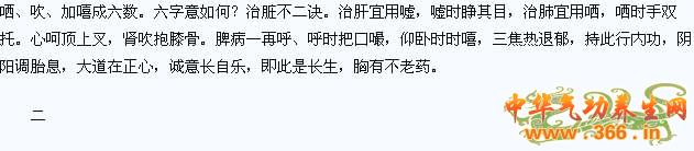 春嘘明目木滋肝,夏至呵心火自闭。秋哂定知金肺润,冬吹惟要坎中安。三焦嘻却除烦热,四季长呼脾化食。切忌出声闻口耳,其功尤胜保命丹。