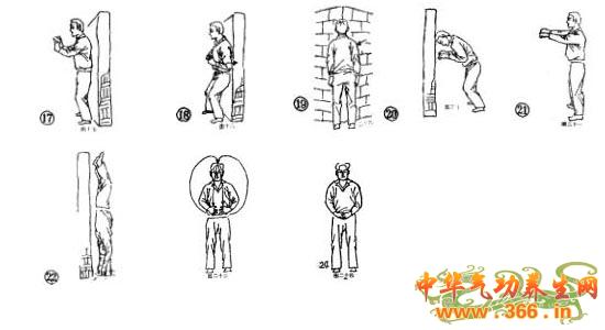 面向墙壁,距墙一尺左右,双手拳面着地.俯身倒立,吸气时双手用力撑直,喷气时将头撞地面(田22)反复做49次。