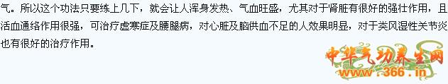 此功法主要用来打通任脉,对增强五脏功能效果卓著,尤其对肝脏有很好的养护作用,对肠胃疾病、便秘、妇科病痛经、不孕等诸症都有很好的疗效,减肥消脂的作用也非常明显。任脉乃阴经之海,总调阴经各脉,对于更年期妇女尤为重要。