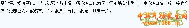 所守,存无所存之时,自然与光明混融为一,我即是光,光即是我。虚空之中,空无一物,唯此一团圆光。此时,练功者觉得身心俱泯,一尘不染,自身如在太极混沌未判之先,虚空圆光宛如一团圆月,宇宙虚空,茫茫太虚,唯此一轮明月,恬静生辉,照澈古今。心田无秽,性地绝尘,已入混忘之上乘功境。