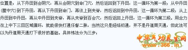 此法的最大特点就是用念力打通任督二脉,不同于小周天功的是,此法分三段打通任督二脉。这三段的