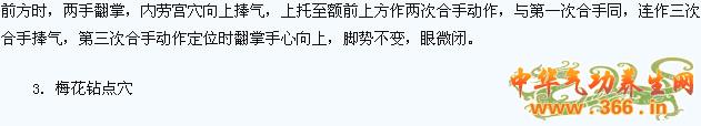 两手由掌变成梅花钻(即:食指、中指、大拇指三指尖靠拢、无名指、小指自然回钩),两手梅花钻相对后同时上移至前胸,稍停片刻(3~5秒钟),继续向上移,将梅花钻指尖点在头维上,停5~10秒钟,然后将梅花钻指尖再点在太阳穴上,停5一10秒钟,继续将指尖点在风池穴、大迎穴、气户穴上,各停5一 10秒钟,双脚势不变,眼微闭内视所点之处的穴位。