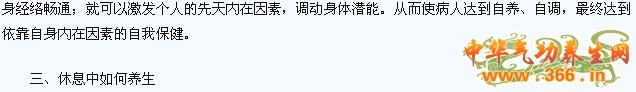 纯粹的睡眠,决不是积极的高层次的休息,百无聊赖更不是。积极的休息有两个层次:一是气功态下的琴棋书画歌舞,一是半功态半睡眠态的“睡觉”大法。习练过三清功的人都知道,系列功法磁带中有气功歌带功带。参加功艺班学习的学员,大多数人在气功歌的带动下进入气功态,原本不会跳舞的人也可能翩翩起舞。这种松静自然状态下的舞蹈或引吭高歌,与常态下的歌舞大不相同,对彻底放松身心,消除疲劳和治疗疾病有特殊的效果。