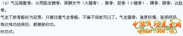 (1)气聚丹田,慢慢移向会阴,把气运向骶骨尖,沿着脊柱节节上升,直至大椎。然后分两肩,顺着肩胛骨向肱骨(手臂骨)运气,顺下向尺骨、桡骨(小手臂骨),再向腕骨、掌骨、指骨。