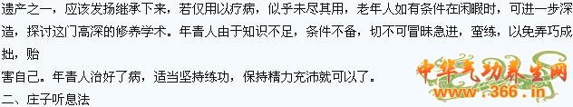 庄子听呼吸法原为性命双修的基础,古今注《庄子》者,几乎没有一人把这层工夫全部明白开示于后学,他们多数是由于不懂,少数是出于保密,遂致此法埋没两千余年,几乎灭绝。这是道家学说的优秀