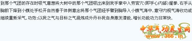 三.形体采纳天地灵气法:此功最好在清晨迎着旭日东升面东练习或夜间迎着(面向着)满月或北斗星练习.(1)自然站立双脚分开略比肩宽.双手重叠贴于小腹气海处.闭目意想自己顶天立地高大无比天地间只有自己一人.再瞑想天地阴阳二气交融混为一体如光如雾光华闪烁.我形体浸淫在无边无际的混元气中.混元气充盈于我五脏六俯四肢百骸筋骨皮肉之中无所不至.被我身体组织细胞尽情吸收.人体在气的沟通下与天地融为一体.然后反复默念:"我在气中.气在我中.天人合一.气为我用."数遍.然后吸气意想自头顶吸天之阳气自双脚吸地之阴气(地之精气).到气海汇聚成一团.呼气时意想体内浊气经周身毛孔呼射出天地之外(呈圆形扩散).如此反复时间不限.(2)睁眼.双腿微屈膝不超过足尖上身正直.目视远方天际.双手臂抬起伸直其高度略比肩低一些双手变为剑指.周身放松.松而不懈.形成"高马步剑指桩"吸气意想周身毛孔张开天地间宇宙中所有混元真气(如光如雾之光气)通过毛孔吸进来汇聚于气海中形成一团.呼气.意想体内所有病气浊气烦闷之气(灰色或灰白色如烟如雾)通过剑指呼射出到天际外随息尽而消融.如此反复练习意念始终不离气海和剑指.时间以双臂双腿酸累支持不住为止.功中要精神集中放松形体不可分心.收式:起身双腿伸直左脚收回半步成自然站立式.同时双手收回合十于胸前在分开重叠贴于小腹上.意念将天地光气及周身四肢百骸之气收回气海中汇聚成一团.意守内视气海片刻.最后双手离开小腹二三寸做顺时针方向划圈运动由小到大再由大到小.划圈时意想搅动气海中的光气旋转向气海中心汇聚成丹.再双手对气海推拉固气.最后双手重叠贴于小腹上意守内视气海片刻.功效:采聚天地间的灵气.增长功力极为迅速.练功百日必见奇效.功深后练功采气时百里之内的灵气都可自然地被你采吸入体内.还可练出体感功能.