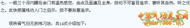 肾气归元气功崇尚自然。在功法上是自然呼吸,不别家气功那样把呼吸压抑为腹式的慢、细、悠、长,也无须固守丹田。此功法能疏通各个经络臟腑,发功快,见效速,使神、体、气三者即人的精神、形体和气息有效地结合起来,经过迴圈渐进,持之以恆地认真锻炼,从而使五臟六腑、十二经脉、奇经八脉等得到充分的调理,进而达到保健强身、防病治病、抵御早衰、延年益寿的目的。