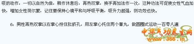5:男性用双掌互相摩擦至掌心发热以左手托住阴囊向上抬起些,用右掌心从右腹以肚脐为中心点经胃部往下侧绕到下腹部底,作大圆八十一圈。要肉挨肉皮挨皮,有热感为佳。不要用力过猛,然后再换左掌由左侧经胃部向下右侧绕过下腹也作大圆八十一次,意念集中于肚脐神阙穴处。