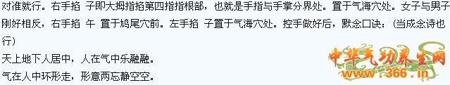 按阴阳五行的相生顺序,拍打或点按十二原穴。顺序为:太渊——太溪——太冲——太白——鸠尾——气海 。若取点穴,以旋点为好。男子每穴点七下,要默数数字。先点左穴,后点右穴,如太渊穴,先用右手中指点按左手的太渊穴,再用左手中指点按右手的太渊穴。女子则每穴点六下。也要数数字。与男子相反,先点右穴,再点左穴。鸠尾穴和气海穴,则由双手中指相触,同时点穴。男子先逆时针旋点七下,在顺时针旋点七下。女子则先顺后逆,各旋点六下。