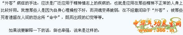 外客的以太附着了被附着者的身体,从而对其自身的以太造成了不好的影响,其实是这样的,一个人的躯壳其实只适合其本身的灵魂的存在,如果有个附加品的话,那这个躯壳就无法同时供应给存在在其中的两个以太力量以足够的生命原动力,这样的话机体上就有了沉重的负担,在表面上是找不到什么具体的科学上的疾病的,而事实上,却是被外来的人们自身就有却不了解甚至不相信的东西所侵犯了,而后就出现了身体负担现象。