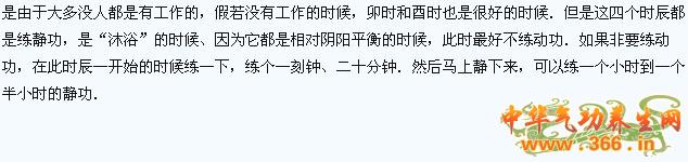 下午下班时练功好不好?按中医讲,这时候是肾气最盛的时候,练功是不错.你要再练静功,静下来,可以使肾脏储存更多的能量,提高坚力、可是这一下班,心里想着家里得买菜做晚饭,孩子放学还等着呢。你急得要命,坐在那练功心里能静下来练功呜?好不容易抓了点时间.练了几分钟,一看时间晚了.赶快往家跑.刚才好不容易静下来的心静,这一紧张、一急躁,体内平衡又被破坏了.因此往往此时练功效果也不好.