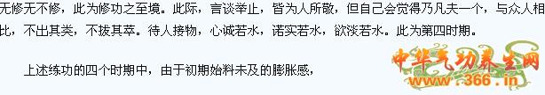 二、第二时期,就像人登上高山,两眼看到的却是平地一样,由于身心内外已协调平衡,与宇宙万物相合的感觉也不再新鲜,此外,一些在“我执”驱使下所作的练功、发功会被证明无效。所以,这一时期,人逐渐会冷静下来,认识到自己只不过是宇宙的一个信息元,一个全息点,在社会中不是神仙,更不是佛,只是一个有一定觉悟、有一定功力的人。自己没有理由功亏一筹,不应当把自我迷信变成众人的迷信,制造歪理邪说。只有顺应自然、社会规律才能练好功,因此,做一个有理性的好人,不断完善自我(而不是固执地认为自我不需要完善),才能保持功增德进。到了这一时期,人一方面练功,一方面会很注重内心的审视和操行的美好。但无论如何,最初那种强烈的气感、顶天立地、力拔山兮气盖世的感觉没有了,进入一个相对平定的时期,佛门禅学上叫做“心一境性”时期。