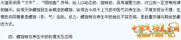 养生运动要形气兼顾。《易筋经》曰:“精气神无形之物也,筋骨肉有形之物也,必先练有形者为无形之佐,培无形者为有形者之辅。若专培无形而弃有形则不可,练有形而弃无形则更不可。所以有形之身必得无形之气相依而不相违,乃成不坏之体。”螺旋转在养生中分形体螺旋和气场螺旋。