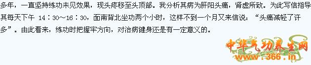 这样,古人不仅讲明了“五脏”与“五位”的相互关系,也给患者指明了练功方向,即可根据脏腑病情的虚实,是虚证还是实证,以背对虚,面朝实,就是患者的正确练功方向,因为背属阳为收,摄取。如因肾虚所致疾病,即面南背北进行练功,以增强肾气,达到肾(水)之精以养肝,肝(木)藏血上济于心,心(火)之热能以温脾,脾(土)化生水谷以充肺,肺(金)清肃下行以助肾水,这样就达到五脏相互资生的良性循环,身体也就自然康复。如今年刚过春节接到河南驻马店一姓赵女士来信,诉:偏头痛10