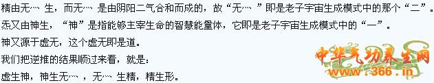 形体(包括细胞)是由最精微的元素构成,既形由精生,这个形即是老子宇宙生成模式所指的终极产品“万物”中的一类。精则是那个模式中的“三”,即五大类属性的物质之一。现代科学已证到这一步,但再往前推,就无能为力了。而传统的人体科学,却在内修中悟证到下面几步。