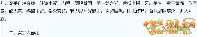 过去有修道者为清除杂念,往往默念一些有利炼功入静的字或词句,由此念決的意念与呼吸融为一体。默字可以使涣散的意识集中起来,常以默念为主。比如静坐后,在脑海里存想一“静”字或“清静”等字,存想的字句由炼功者自定,一般应在九个字范围内。此外,也有入静前念诵道经的。念诵道经前可先焚香,以渲染气氛。以坐默诵为好,念诵的次数由各人自定,以达入静为目的。