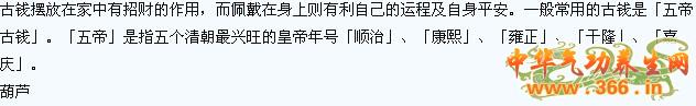 葫芦是可用作除病之用,只须挂在病者的睡床前或摆放在病者的睡侧。葫芦挂在大门外,则有保屋内人平安的作用。葫芦可采用天然葫芦瓜晒干成品或铜制葫芦。但要注意铜器并不一定适合每个人,要视乎你的五行。