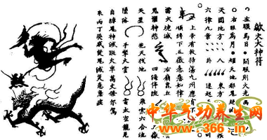歘火大神,全称为「九天歘火律令大神炎帝邓天君」,名燮,字伯温,为雷部主帅,形象十分狰狞威猛,此符聚形後显然就是这种形象的剪影(见下图)。