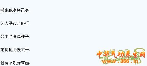 四、渡气法:在采气炼气的基础上,道中人称鼎内有了真种子,内气充盈,自我感觉精满气足神旺,能够内气外发之时,发外气渡人,为人消灾去病。也奉送四句话: