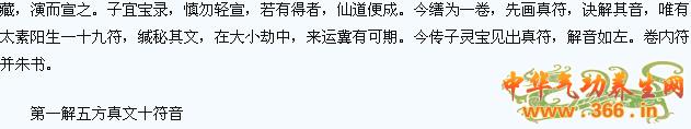 音曰:赤明开真,三天气和,洞丹阳光,五藏不枯,丹天所保,朱宫扶苏,纳炼流泉,生元无徂。三十二字,紫笔书文。一云三气所保。
