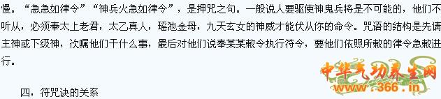 符咒法术多允邀请主神借兵将相助护法,接着请属下神兵神将相助,打鬼斩煞,祛疾镇宅,消灾解厄。所以法术有效否与鬼神之是否熟悉息息相关。咒自心出,符由心写,如此才能动天地而惊鬼神。咒语结句如“奉太乙真人急急如律令”是咒的敕令句,再如“奉九天玄女神兵火急如律令”等等是告诉神兵神将,说明术若是奉某某神灵所定的敕令叫他们行事的。要他们急速依照,天律敕令而兴兵不可怠