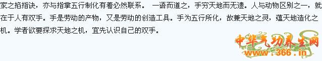 手相有先天、后天之别:本人命运,为后天,少年到老年也;家庭(六亲宫)运则为先天。故先父母,后兄弟,再自己,再妻妾,再子女也。内为先天,外为后天,故先天父兄,后天妻子也。 五指为五行所化,为五脏之端,为五志之态。指掌所属,在医学和气功中有广泛的应用。